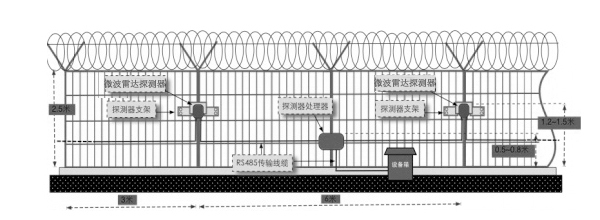 探測(cè)器采用壁掛方式布設(shè)在圍欄上,探測(cè)器之間通過RS-485總線相連,并匯聚到探測(cè)處理主機(jī)。此方案融合微波雷達(dá)和MEMS振動(dòng)兩種入侵探測(cè)技術(shù),兼具主動(dòng)和被動(dòng)探測(cè)方式,具有預(yù)警距離遠(yuǎn),定位精度高,適應(yīng)性強(qiáng),易于安裝和調(diào)試等特點(diǎn),適用于民航、核電、物流、石油、電力、煙草、公安、司法等行業(yè)。